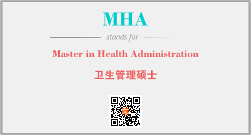 英文缩略词“MHA”经常作为“Master in Health Administration”的英文缩写来使用,中文表示:“卫生管理硕士”。本文将详细介绍英文缩写词MHA所代表英文单词,其对应的中文拼音、详细解释以及在英语中的流行度。此外,还有关于缩略词MHA的分类、应用领域及相关应用示例等。