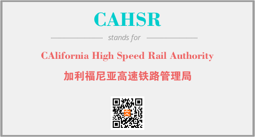 英文缩略词“CAHSR”经常作为“CAlifornia High Speed Rail Authority”的英文缩写来使用,中文表示:“加利福尼亚高速铁路管理局”。本文将详细介绍英文缩写词CAHSR所代表英文单词,其对应的中文拼音、详细解释以及在英语中的流行度。此外,还有关于缩略词CAHSR的分类、应用领域及相关应用示例等。