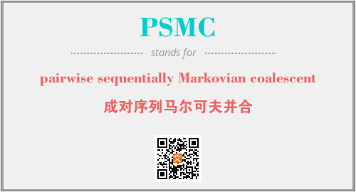 上述内容是“pairwise sequentially Markovian coalescent”作为“PSMC”的缩写,解释为“成对序列马尔可夫并合”时的信息,以及英文缩略词PSMC所代表的英文单词,其对应的中文拼音、详细解释以及在英文中的流行度和相关分类、应用领域及应用示例等。