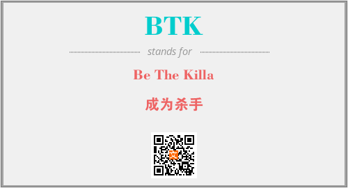 上述内容是“Be The Killa”作为“BTK”的缩写,解释为“成为杀手”时的信息,以及英文缩略词BTK所代表的英文单词,其对应的中文拼音、详细解释以及在英文中的流行度和相关分类、应用领域及应用示例等。