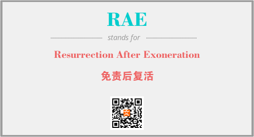 上述内容是“Resurrection After Exoneration”作为“RAE”的缩写,解释为“免责后复活”时的信息,以及英文缩略词RAE所代表的英文单词,其对应的中文拼音、详细解释以及在英文中的流行度和相关分类、应用领域及应用示例等。