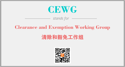 上述内容是“Clearance and Exemption Working Group”作为“CEWG”的缩写,解释为“清除和豁免工作组”时的信息,以及英文缩略词CEWG所代表的英文单词,其对应的中文拼音、详细解释以及在英文中的流行度和相关分类、应用领域及应用示例等。