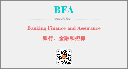 上述内容是“Banking Finance and Assurance”作为“BFA”的缩写,解释为“银行、金融和担保”时的信息,以及英文缩略词BFA所代表的英文单词,其对应的中文拼音、详细解释以及在英文中的流行度和相关分类、应用领域及应用示例等。