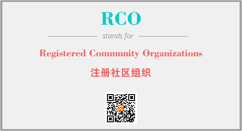 上述内容是“Registered Community Organizations”作为“RCO”的缩写,解释为“注册社区组织”时的信息,以及英文缩略词RCO所代表的英文单词,其对应的中文拼音、详细解释以及在英文中的流行度和相关分类、应用领域及应用示例等。