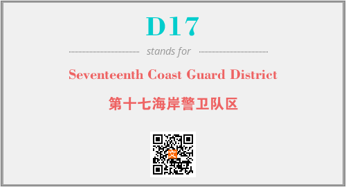 英文缩略词“D17”经常作为“Seventeenth Coast Guard District”的英文缩写来使用,中文表示:“第十七海岸警卫队区”。本文将详细介绍英文缩写词D17所代表英文单词,其对应的中文拼音、详细解释以及在英语中的流行度。此外,还有关于缩略词D17的分类、应用领域及相关应用示例等。