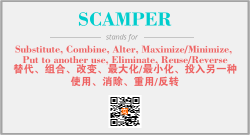 上述内容是“Substitute, Combine, Alter, Maximize/Minimize, Put to another use, Eliminate, Reuse/Reverse”作为“SCAMPER”的缩写,解释为“替代、组合、改变、最大化/最小化、投入另一种使用、消除、重用/反转”时的信息,以及英文缩略词SCAMPER所代表的英文单词,其对应的中文拼音、详细解释以及在英文中的流行度和相关分类、应用领域及应用示例等。
