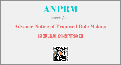 英文缩略词“ANPRM”经常作为“Advance Notice of Proposed Rule Making”的英文缩写来使用,中文表示:“拟定规则的提前通知”。本文将详细介绍英文缩写词ANPRM所代表英文单词,其对应的中文拼音、详细解释以及在英语中的流行度。此外,还有关于缩略词ANPRM的分类、应用领域及相关应用示例等。