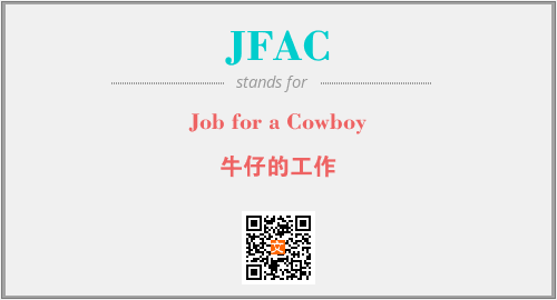 上述内容是“Job for a Cowboy”作为“JFAC”的缩写,解释为“牛仔的工作”时的信息,以及英文缩略词JFAC所代表的英文单词,其对应的中文拼音、详细解释以及在英文中的流行度和相关分类、应用领域及应用示例等。