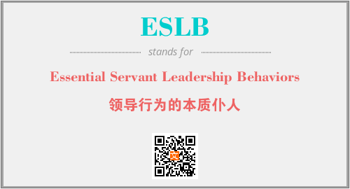 英文缩略词“ESLB”经常作为“Essential Servant Leadership Behaviors”的英文缩写来使用,中文表示:“领导行为的本质仆人”。本文将详细介绍英文缩写词ESLB所代表英文单词,其对应的中文拼音、详细解释以及在英语中的流行度。此外,还有关于缩略词ESLB的分类、应用领域及相关应用示例等。
