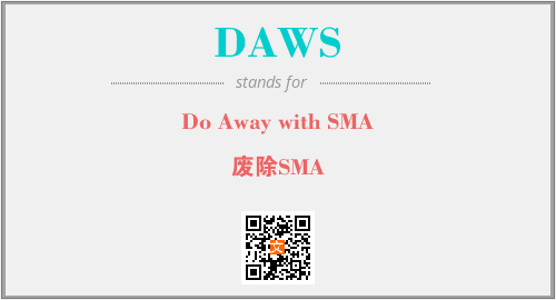 英文缩略词“DAWS”经常作为“Do Away with SMA”的英文缩写来使用,中文表示:“废除SMA”。本文将详细介绍英文缩写词DAWS所代表英文单词,其对应的中文拼音、详细解释以及在英语中的流行度。此外,还有关于缩略词DAWS的分类、应用领域及相关应用示例等。