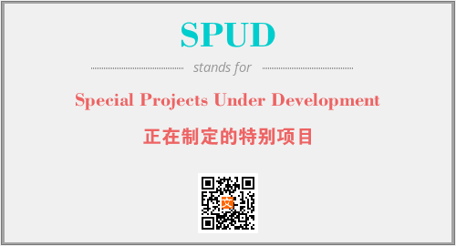 英文缩略词“SPUD”经常作为“Special Projects Under Development”的英文缩写来使用,中文表示:“正在制定的特别项目”。本文将详细介绍英文缩写词SPUD所代表英文单词,其对应的中文拼音、详细解释以及在英语中的流行度。此外,还有关于缩略词SPUD的分类、应用领域及相关应用示例等。