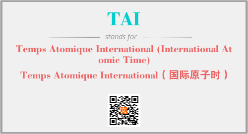 英文缩略词“TAI”经常作为“Temps Atomique International (International Atomic Time)”的英文缩写来使用,中文表示:“Temps Atomique International(国际原子时)”。本文将详细介绍英文缩写词TAI所代表英文单词,其对应的中文拼音、详细解释以及在英语中的流行度。此外,还有关于缩略词TAI的分类、应用领域及相关应用示例等。