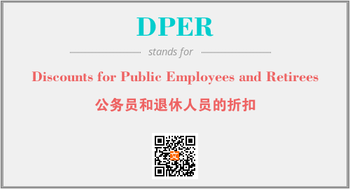 上述内容是“Discounts for Public Employees and Retirees”作为“DPER”的缩写,解释为“公务员和退休人员的折扣”时的信息,以及英文缩略词DPER所代表的英文单词,其对应的中文拼音、详细解释以及在英文中的流行度和相关分类、应用领域及应用示例等。
