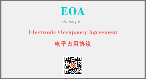英文缩略词“EOA”经常作为“Electronic Occupancy Agreement”的英文缩写来使用,中文表示:“电子占用协议”。本文将详细介绍英文缩写词EOA所代表英文单词,其对应的中文拼音、详细解释以及在英语中的流行度。此外,还有关于缩略词EOA的分类、应用领域及相关应用示例等。