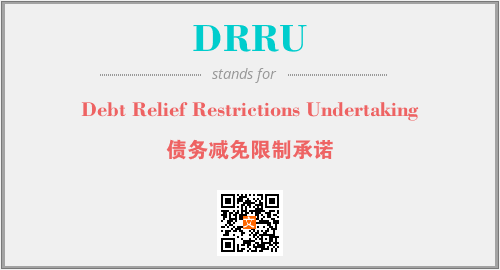 英文缩略词“DRRU”经常作为“Debt Relief Restrictions Undertaking”的英文缩写来使用,中文表示:“债务减免限制承诺”。本文将详细介绍英文缩写词DRRU所代表英文单词,其对应的中文拼音、详细解释以及在英语中的流行度。此外,还有关于缩略词DRRU的分类、应用领域及相关应用示例等。