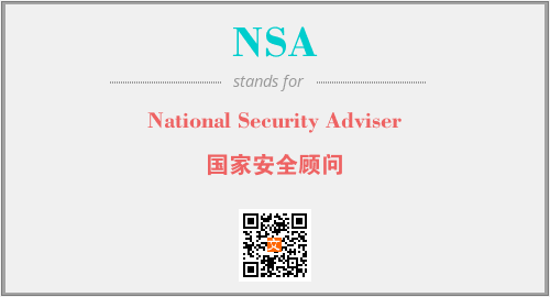 上述内容是“National Security Adviser”作为“NSA”的缩写,解释为“国家安全顾问”时的信息,以及英文缩略词NSA所代表的英文单词,其对应的中文拼音、详细解释以及在英文中的流行度和相关分类、应用领域及应用示例等。