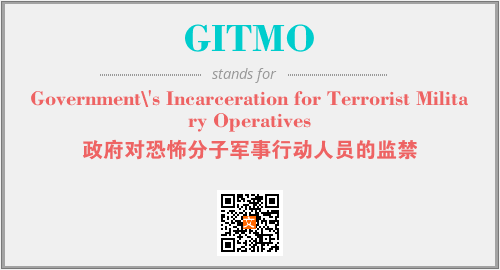 上述内容是“Government\'s Incarceration for Terrorist Military Operatives”作为“GITMO”的缩写,解释为“政府对恐怖分子军事行动人员的监禁”时的信息,以及英文缩略词GITMO所代表的英文单词,其对应的中文拼音、详细解释以及在英文中的流行度和相关分类、应用领域及应用示例等。
