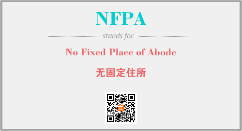 英文缩略词“NFPA”经常作为“No Fixed Place of Abode”的英文缩写来使用,中文表示:“无固定住所”。本文将详细介绍英文缩写词NFPA所代表英文单词,其对应的中文拼音、详细解释以及在英语中的流行度。此外,还有关于缩略词NFPA的分类、应用领域及相关应用示例等。