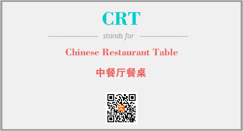 英文缩略词“CRT”经常作为“Chinese Restaurant Table”的英文缩写来使用,中文表示:“中餐厅餐桌”。本文将详细介绍英文缩写词CRT所代表英文单词,其对应的中文拼音、详细解释以及在英语中的流行度。此外,还有关于缩略词CRT的分类、应用领域及相关应用示例等。