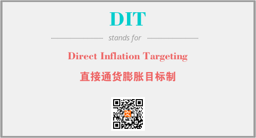 上述内容是“Direct Inflation Targeting”作为“DIT”的缩写,解释为“直接通货膨胀目标制”时的信息,以及英文缩略词DIT所代表的英文单词,其对应的中文拼音、详细解释以及在英文中的流行度和相关分类、应用领域及应用示例等。