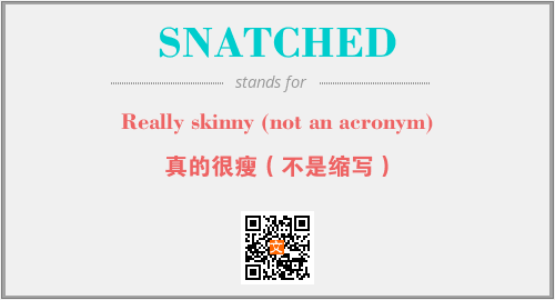 上述内容是“Really skinny (not an acronym)”作为“SNATCHED”的缩写,解释为“真的很瘦(不是缩写)”时的信息,以及英文缩略词SNATCHED所代表的英文单词,其对应的中文拼音、详细解释以及在英文中的流行度和相关分类、应用领域及应用示例等。
