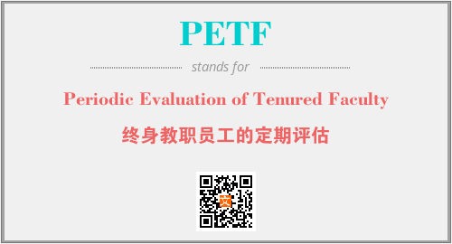 上述内容是“Periodic Evaluation of Tenured Faculty”作为“PETF”的缩写,解释为“终身教职员工的定期评估”时的信息,以及英文缩略词PETF所代表的英文单词,其对应的中文拼音、详细解释以及在英文中的流行度和相关分类、应用领域及应用示例等。