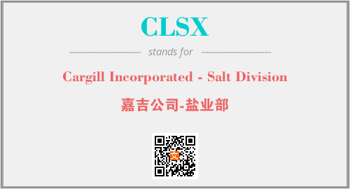 上述内容是“Cargill Incorporated - Salt Division”作为“CLSX”的缩写,解释为“嘉吉公司-盐业部”时的信息,以及英文缩略词CLSX所代表的英文单词,其对应的中文拼音、详细解释以及在英文中的流行度和相关分类、应用领域及应用示例等。