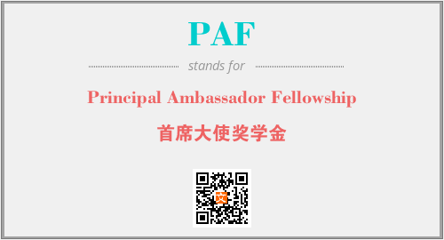 英文缩略词“PAF”经常作为“Principal Ambassador Fellowship”的英文缩写来使用,中文表示:“首席大使奖学金”。本文将详细介绍英文缩写词PAF所代表英文单词,其对应的中文拼音、详细解释以及在英语中的流行度。此外,还有关于缩略词PAF的分类、应用领域及相关应用示例等。