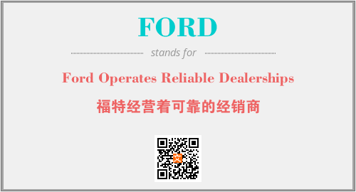 英文缩略词“FORD”经常作为“Ford Operates Reliable Dealerships”的英文缩写来使用,中文表示:“福特经营着可靠的经销商”。本文将详细介绍英文缩写词FORD所代表英文单词,其对应的中文拼音、详细解释以及在英语中的流行度。此外,还有关于缩略词FORD的分类、应用领域及相关应用示例等。