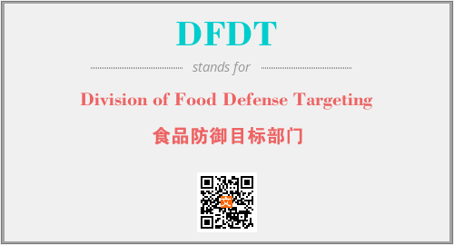 上述内容是“Division of Food Defense Targeting”作为“DFDT”的缩写,解释为“食品防御目标部门”时的信息,以及英文缩略词DFDT所代表的英文单词,其对应的中文拼音、详细解释以及在英文中的流行度和相关分类、应用领域及应用示例等。