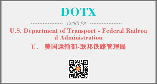 英文缩略词“DOTX”经常作为“U.S. Department of Transport - Federal Railroad Administration”的英文缩写来使用,中文表示:“U、 美国运输部-联邦铁路管理局”。本文将详细介绍英文缩写词DOTX所代表英文单词,其对应的中文拼音、详细解释以及在英语中的流行度。此外,还有关于缩略词DOTX的分类、应用领域及相关应用示例等。