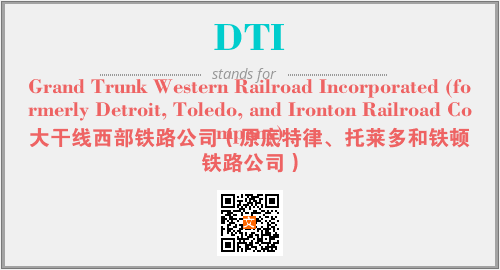 上述内容是“Grand Trunk Western Railroad Incorporated (formerly Detroit, Toledo, and Ironton Railroad Company)”作为“DTI”的缩写,解释为“大干线西部铁路公司(原底特律、托莱多和铁顿铁路公司)”时的信息,以及英文缩略词DTI所代表的英文单词,其对应的中文拼音、详细解释以及在英文中的流行度和相关分类、应用领域及应用示例等。