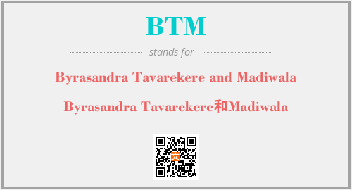 上述内容是“Byrasandra Tavarekere and Madiwala”作为“BTM”的缩写,解释为“Byrasandra Tavarekere和Madiwala”时的信息,以及英文缩略词BTM所代表的英文单词,其对应的中文拼音、详细解释以及在英文中的流行度和相关分类、应用领域及应用示例等。