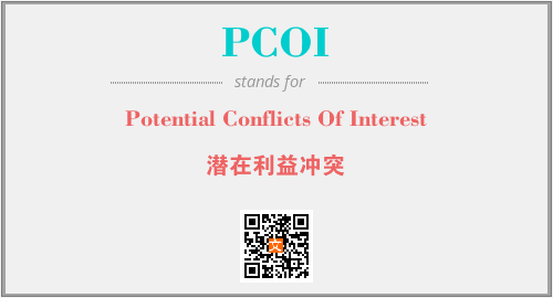 上述内容是“Potential Conflicts Of Interest”作为“PCOI”的缩写,解释为“潜在利益冲突”时的信息,以及英文缩略词PCOI所代表的英文单词,其对应的中文拼音、详细解释以及在英文中的流行度和相关分类、应用领域及应用示例等。
