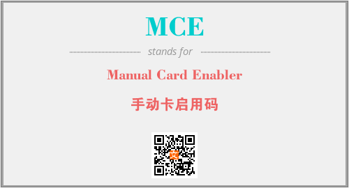 英文缩略词“MCE”经常作为“Manual Card Enabler”的英文缩写来使用,中文表示:“手动卡启用码”。本文将详细介绍英文缩写词MCE所代表英文单词,其对应的中文拼音、详细解释以及在英语中的流行度。此外,还有关于缩略词MCE的分类、应用领域及相关应用示例等。