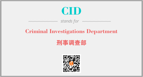 上述内容是“Criminal Investigations Department”作为“CID”的缩写,解释为“刑事调查部”时的信息,以及英文缩略词CID所代表的英文单词,其对应的中文拼音、详细解释以及在英文中的流行度和相关分类、应用领域及应用示例等。