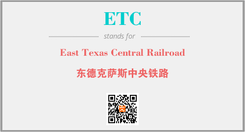 上述内容是“East Texas Central Railroad”作为“ETC”的缩写,解释为“东德克萨斯中央铁路”时的信息,以及英文缩略词ETC所代表的英文单词,其对应的中文拼音、详细解释以及在英文中的流行度和相关分类、应用领域及应用示例等。