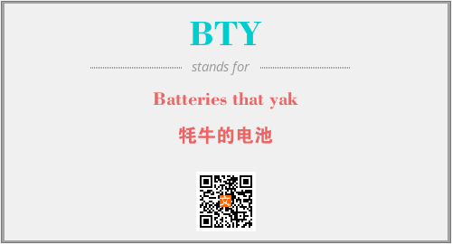 英文缩略词“BTY”经常作为“Batteries that yak”的英文缩写来使用,中文表示:“牦牛的电池”。本文将详细介绍英文缩写词BTY所代表英文单词,其对应的中文拼音、详细解释以及在英语中的流行度。此外,还有关于缩略词BTY的分类、应用领域及相关应用示例等。
