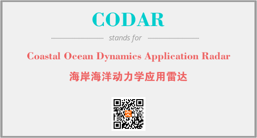 上述内容是“Coastal Ocean Dynamics Application Radar”作为“CODAR”的缩写,解释为“海岸海洋动力学应用雷达”时的信息,以及英文缩略词CODAR所代表的英文单词,其对应的中文拼音、详细解释以及在英文中的流行度和相关分类、应用领域及应用示例等。