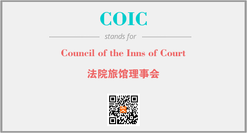 英文缩略词“COIC”经常作为“Council of the Inns of Court”的英文缩写来使用,中文表示:“法院旅馆理事会”。本文将详细介绍英文缩写词COIC所代表英文单词,其对应的中文拼音、详细解释以及在英语中的流行度。此外,还有关于缩略词COIC的分类、应用领域及相关应用示例等。