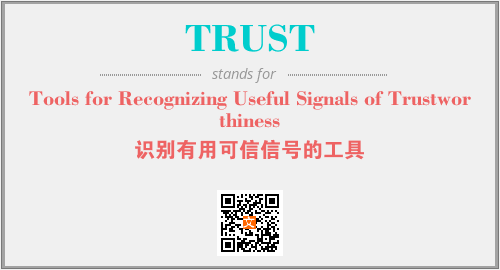 上述内容是“Tools for Recognizing Useful Signals of Trustworthiness”作为“TRUST”的缩写,解释为“识别有用可信信号的工具”时的信息,以及英文缩略词TRUST所代表的英文单词,其对应的中文拼音、详细解释以及在英文中的流行度和相关分类、应用领域及应用示例等。
