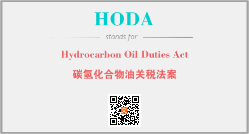 上述内容是“Hydrocarbon Oil Duties Act”作为“HODA”的缩写,解释为“碳氢化合物油关税法案”时的信息,以及英文缩略词HODA所代表的英文单词,其对应的中文拼音、详细解释以及在英文中的流行度和相关分类、应用领域及应用示例等。