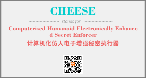 上述内容是“Computerised Humanoid Electronically Enhanced Secret Enforcer”作为“CHEESE”的缩写,解释为“计算机化仿人电子增强秘密执行器”时的信息,以及英文缩略词CHEESE所代表的英文单词,其对应的中文拼音、详细解释以及在英文中的流行度和相关分类、应用领域及应用示例等。