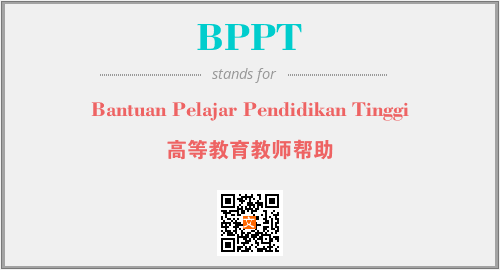 英文缩略词“BPPT”经常作为“Bantuan Pelajar Pendidikan Tinggi”的英文缩写来使用,中文表示:“高等教育教师帮助”。本文将详细介绍英文缩写词BPPT所代表英文单词,其对应的中文拼音、详细解释以及在英语中的流行度。此外,还有关于缩略词BPPT的分类、应用领域及相关应用示例等。