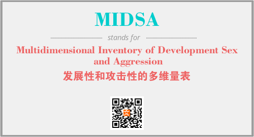 上述内容是“Multidimensional Inventory of Development Sex and Aggression”作为“MIDSA”的缩写,解释为“发展性和攻击性的多维量表”时的信息,以及英文缩略词MIDSA所代表的英文单词,其对应的中文拼音、详细解释以及在英文中的流行度和相关分类、应用领域及应用示例等。