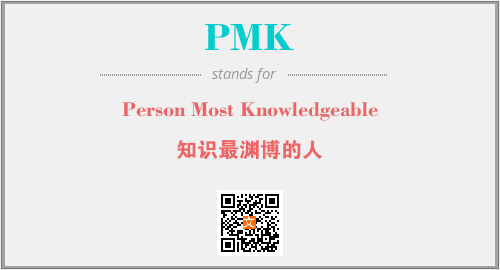 英文缩略词“PMK”经常作为“Person Most Knowledgeable”的英文缩写来使用,中文表示:“知识最渊博的人”。本文将详细介绍英文缩写词PMK所代表英文单词,其对应的中文拼音、详细解释以及在英语中的流行度。此外,还有关于缩略词PMK的分类、应用领域及相关应用示例等。
