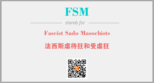 上述内容是“Fascist Sado Masochists”作为“FSM”的缩写,解释为“法西斯虐待狂和受虐狂”时的信息,以及英文缩略词FSM所代表的英文单词,其对应的中文拼音、详细解释以及在英文中的流行度和相关分类、应用领域及应用示例等。