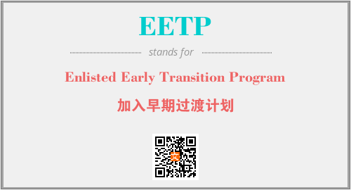 英文缩略词“EETP”经常作为“Enlisted Early Transition Program”的英文缩写来使用,中文表示:“加入早期过渡计划”。本文将详细介绍英文缩写词EETP所代表英文单词,其对应的中文拼音、详细解释以及在英语中的流行度。此外,还有关于缩略词EETP的分类、应用领域及相关应用示例等。