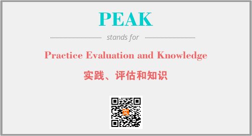上述内容是“Practice Evaluation and Knowledge”作为“PEAK”的缩写,解释为“实践、评估和知识”时的信息,以及英文缩略词PEAK所代表的英文单词,其对应的中文拼音、详细解释以及在英文中的流行度和相关分类、应用领域及应用示例等。