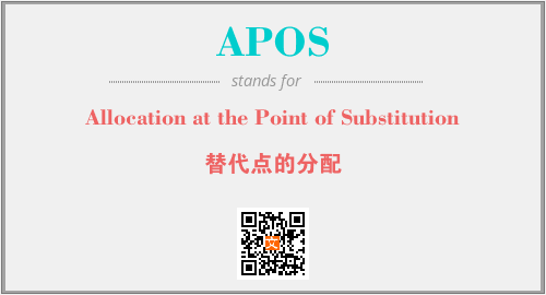 上述内容是“Allocation at the Point of Substitution”作为“APOS”的缩写,解释为“替代点的分配”时的信息,以及英文缩略词APOS所代表的英文单词,其对应的中文拼音、详细解释以及在英文中的流行度和相关分类、应用领域及应用示例等。